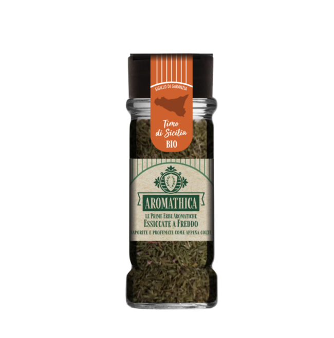 Il Timo è un’erba aromatica originaria del Mediterraneo, appartiene alla famiglia delle Lamiaceae, ha forma a cespugli ed ha un fusto legnoso, delle foglie piccole e lunghe, la cui colorazione va dal verde pallido al grigio. Il Timo secco è un alimento ad alto contenuto di fibre vegetali ed arricchisce di sapore i piatti della tradizione mediterranea.